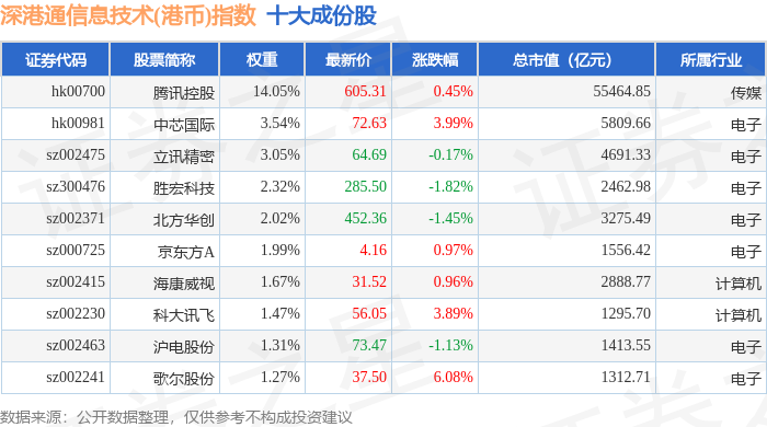 深港通信息技术(港币)(983028)指数十大成份股详情如下: