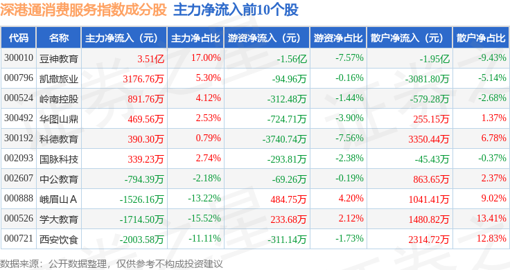 资金流向方面,深港通消费服务(983045)指数成份股当日主力资金净流入合计1.15亿元,游资资金净流出合计1.38亿元,散户资金净流入合计2254.69万元。成份股资金流向详情见下表: