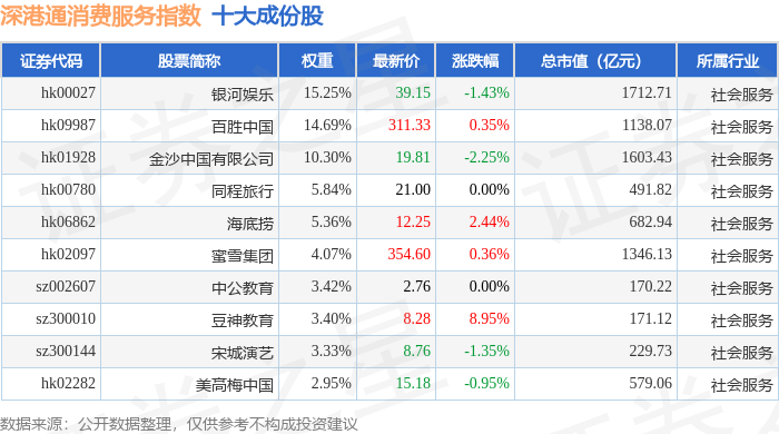 证券之星消息,9月30日,深港通消费服务(983045)指数报收于2823.85点,涨0.02%,成交84.76亿元。当日该指数成份股中,上涨的有23家,豆神教育以8.95%的涨幅领涨,下跌的有18家,云南旅游以2.96%的跌幅领跌。