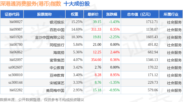 深港通消费服务(港币)(983046)指数十大成份股详情如下: