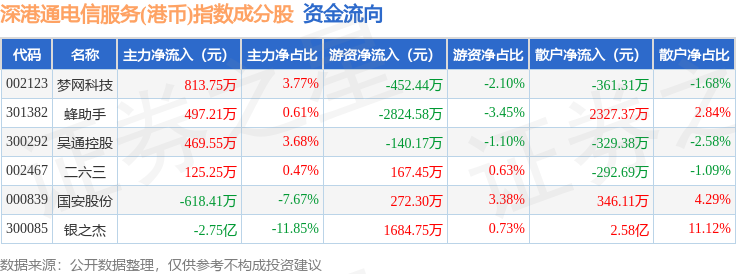 资金流向方面,深港通电信服务(港币)(983058)指数成份股当日主力资金净流出合计2.62亿元,游资资金净流出合计1292.69万元,散户资金净流入合计2.75亿元。成份股资金流向详情见下表: