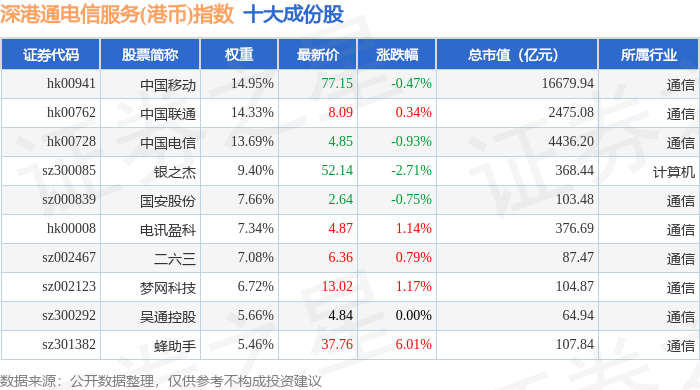 深港通电信服务(港币)(983058)指数十大成份股详情如下: