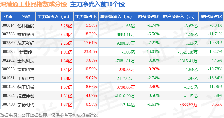 资金流向方面,深港通工业品(983069)指数成份股当日主力资金净流出合计35.07亿元,游资资金净流出合计2.43亿元,散户资金净流入合计37.5亿元。成份股资金流向详情见下表: