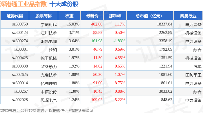 证券之星消息,9月30日,深港通工业品(983069)指数报收于6399.95点,涨1.21%,成交2382.79亿元。当日该指数成份股中,上涨的有185家,新雷能以20.0%的涨幅领涨,下跌的有121家,易成新能以7.14%的跌幅领跌。