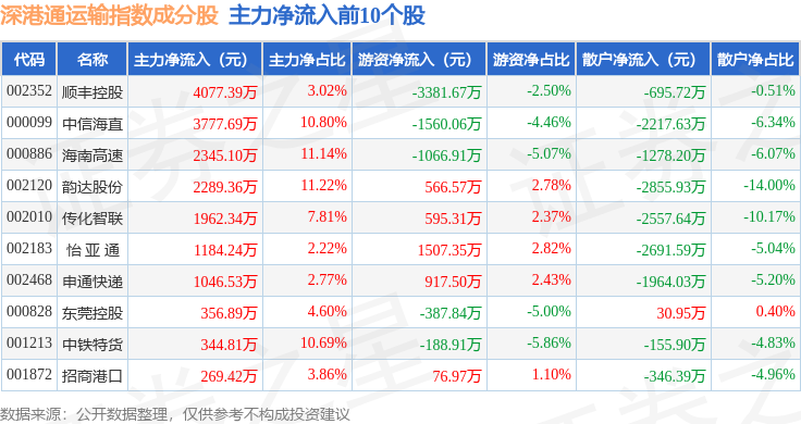 资金流向方面,深港通运输(983077)指数成份股当日主力资金净流入合计1.03亿元,游资资金净流出合计1847.48万元,散户资金净流出合计8499.28万元。成份股资金流向详情见下表: