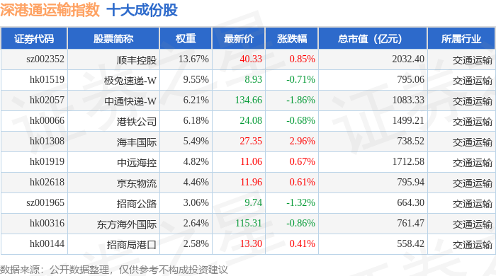 证券之星消息,9月30日,深港通运输(983077)指数报收于4252.3点,涨0.19%,成交79.19亿元。当日该指数成份股中,上涨的有23家,海峡股份以8.05%的涨幅领涨,下跌的有31家,中国外运以3.18%的跌幅领跌。