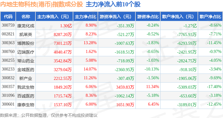 资金流向方面,内地生物科技(港币)(983102)指数成份股当日主力资金净流入合计3.19亿元,游资资金净流入合计8081.34万元,散户资金净流出合计4.0亿元。成份股资金流向详情见下表: