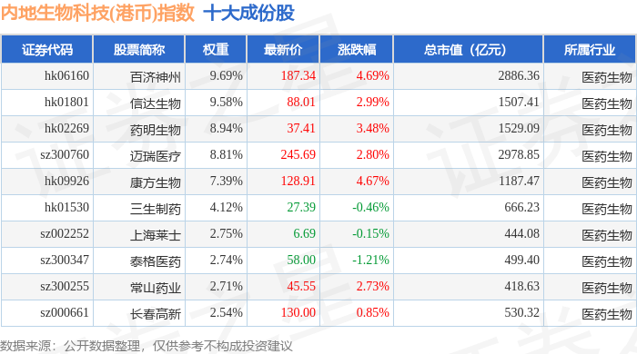 内地生物科技(港币)(983102)指数十大成份股详情如下: