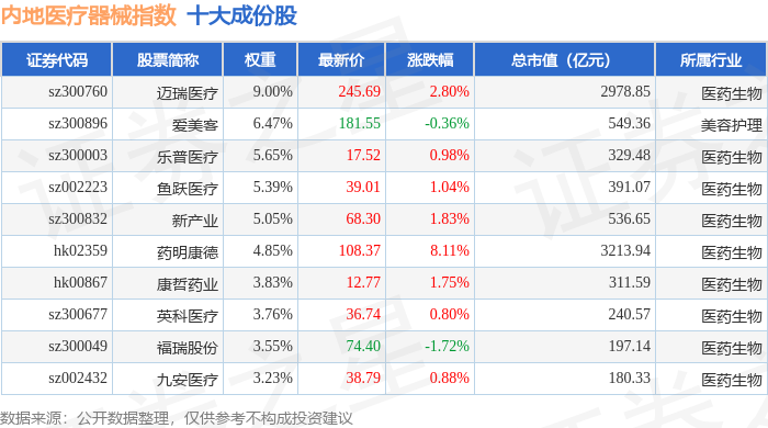 内地医疗器械(983103)指数十大成份股详情如下:
