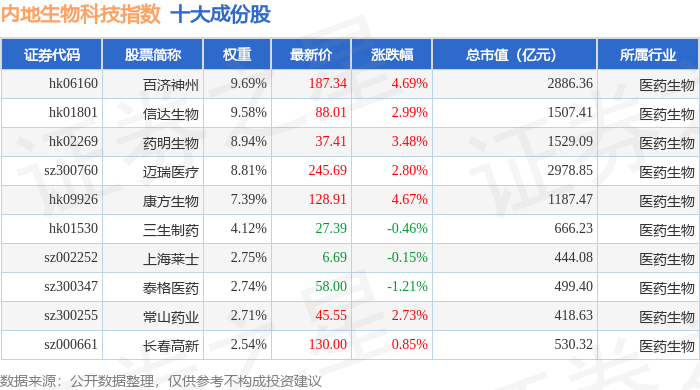 证券之星消息,9月30日,内地生物科技(983101)指数报收于3380.4点,涨2.46%,成交228.25亿元。当日该指数成份股中,上涨的有42家,药明康德以8.11%的涨幅领涨,下跌的有7家,泰格医药以1.21%的跌幅领跌。