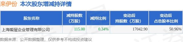 证券之星消息,9月30日来伊份发布公告《来伊份:上海来伊份股份有限公司控股股东权益变动触及1%刻度暨减持结果公告》,其股东上海爱屋企业管理有限公司于2025年9月30日合计减持115.0万股,占公司目前总股本的0.3439%,变动期间该股股价下跌1.08%,截止9月30日收盘报12.78元。