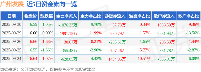 证券之星消息,截至2025年9月30日收盘,广州发展(600098)报收于6.59元,下跌1.05%,换手率0.48%,成交量16.76万手,成交额1.11亿元。