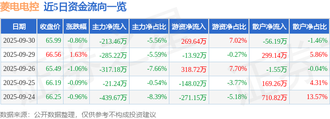 证券之星消息,截至2025年9月30日收盘,菱电电控(688667)报收于65.99元,下跌0.86%,换手率1.11%,成交量5804.0手,成交额3838.46万元。