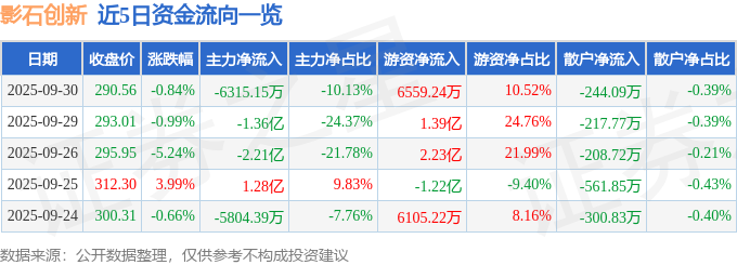 证券之星消息,截至2025年9月30日收盘,影石创新(688775)报收于290.56元,下跌0.84%,换手率7.01%,成交量2.14万手,成交额6.23亿元。
