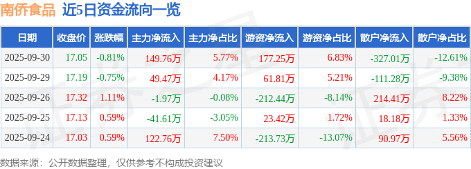 证券之星消息,截至2025年9月30日收盘,南侨食品(605339)报收于17.05元,下跌0.81%,换手率0.36%,成交量1.51万手,成交额2593.72万元。