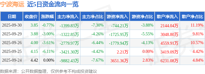 证券之星消息,截至2025年9月30日收盘,宁波海运(600798)报收于3.85元,下跌0.77%,换手率4.11%,成交量49.54万手,成交额1.92亿元。