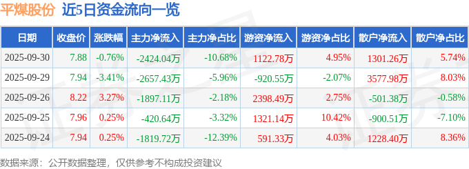 证券之星消息,截至2025年9月30日收盘,平煤股份(601666)报收于7.88元,下跌0.76%,换手率1.17%,成交量28.83万手,成交额2.27亿元。