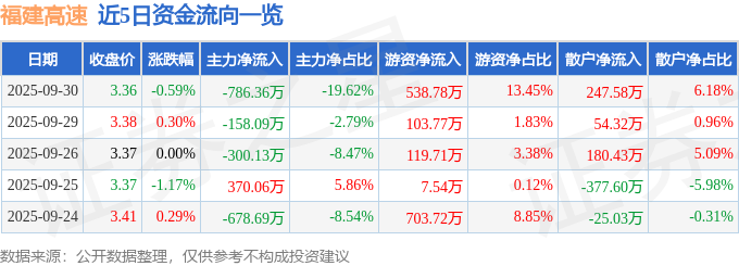 证券之星消息,截至2025年9月30日收盘,福建高速(600033)报收于3.36元,下跌0.59%,换手率0.43%,成交量11.91万手,成交额4006.94万元。