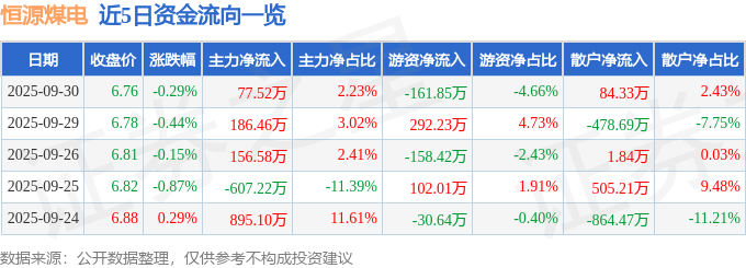 证券之星消息,截至2025年9月30日收盘,恒源煤电(600971)报收于6.76元,下跌0.29%,换手率0.43%,成交量5.13万手,成交额3469.74万元。