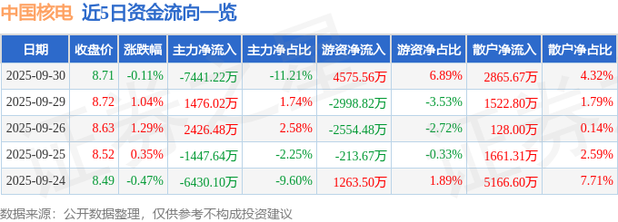 证券之星消息,截至2025年9月30日收盘,中国核电(601985)报收于8.71元,下跌0.11%,换手率0.41%,成交量76.51万手,成交额6.64亿元。