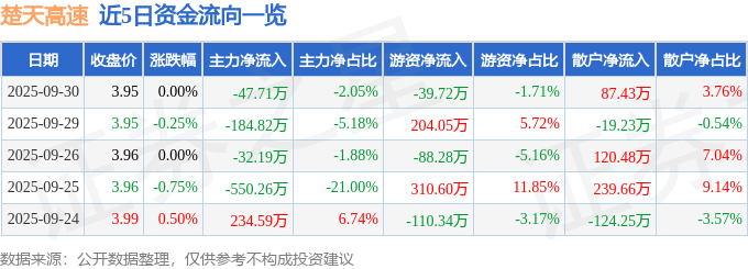 证券之星消息,截至2025年9月30日收盘,楚天高速(600035)报收于3.95元,上涨0.0%,换手率0.37%,成交量5.89万手,成交额2327.01万元。