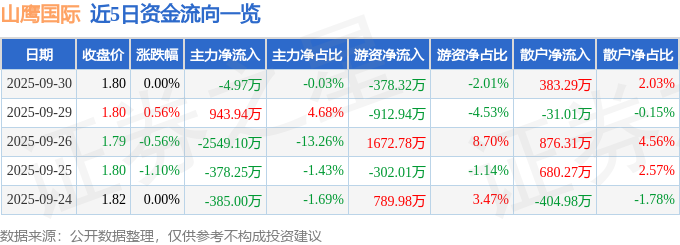 证券之星消息,截至2025年9月30日收盘,山鹰国际(600567)报收于1.8元,上涨0.0%,换手率1.81%,成交量104.96万手,成交额1.88亿元。