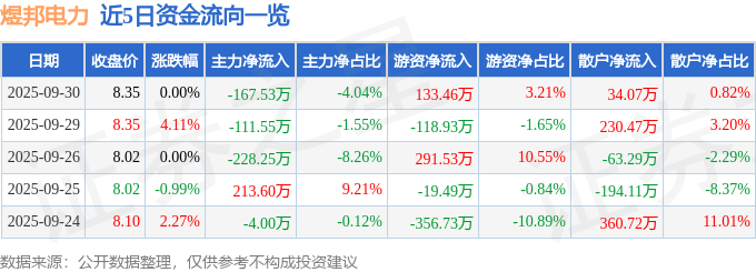 9月30日的资金流向数据方面,主力资金净流出167.53万元,占总成交额4.04%,游资资金净流入133.46万元,占总成交额3.21%,散户资金净流入34.07万元,占总成交额0.82%。