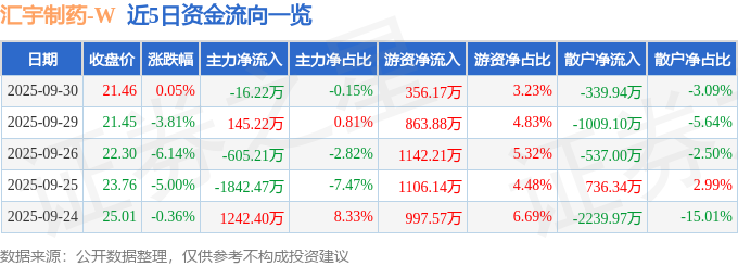 证券之星消息,截至2025年9月30日收盘,汇宇制药(688553)报收于21.46元,上涨0.05%,换手率1.49%,成交量5.12万手,成交额1.1亿元。