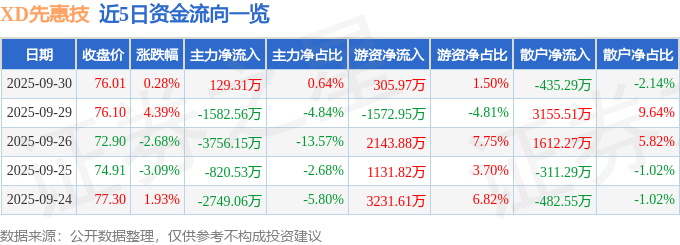 证券之星消息,截至2025年9月30日收盘,XD先惠技(688155)报收于76.01元,上涨0.28%,换手率2.13%,成交量2.68万手,成交额2.04亿元。
