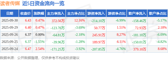 证券之星消息,截至2025年9月30日收盘,读者传媒(603999)报收于6.43元,上涨0.47%,换手率0.83%,成交量4.77万手,成交额3063.61万元。