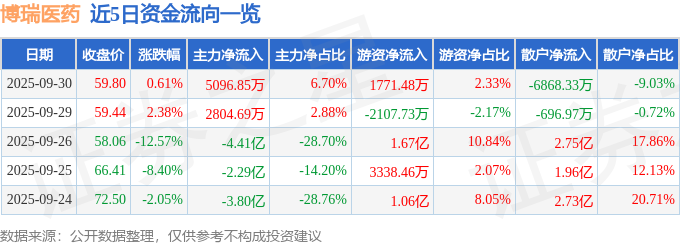 证券之星消息,截至2025年9月30日收盘,博瑞医药(688166)报收于59.8元,上涨0.61%,换手率2.96%,成交量12.51万手,成交额7.61亿元。