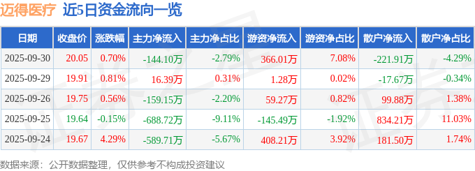 证券之星消息,截至2025年9月30日收盘,迈得医疗(688310)报收于20.05元,上涨0.7%,换手率1.54%,成交量2.56万手,成交额5168.12万元。