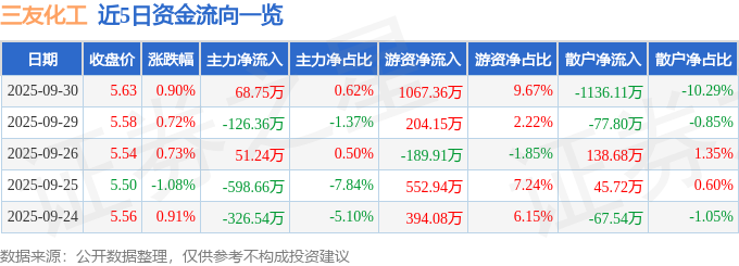 证券之星消息,截至2025年9月30日收盘,三友化工(600409)报收于5.63元,上涨0.9%,换手率0.95%,成交量19.68万手,成交额1.1亿元。