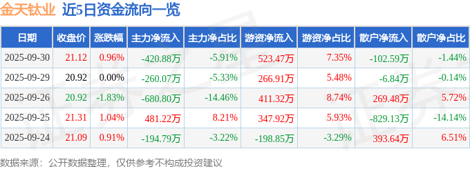 证券之星消息,截至2025年9月30日收盘,金天钛业(688750)报收于21.12元,上涨0.96%,换手率4.03%,成交量3.35万手,成交额7124.59万元。