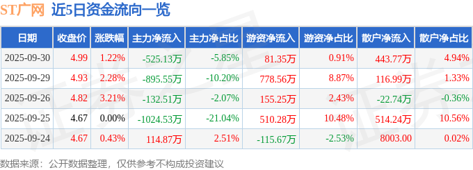 证券之星消息,截至2025年9月30日收盘,ST广网(600831)报收于4.99元,上涨1.22%,换手率2.56%,成交量18.23万手,成交额8974.63万元。