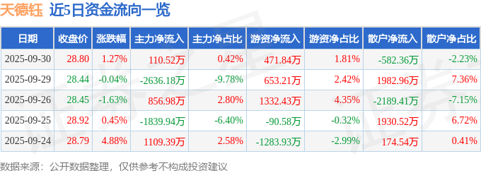 证券之星消息,截至2025年9月30日收盘,天德钰(688252)报收于28.8元,上涨1.27%,换手率4.97%,成交量9.06万手,成交额2.61亿元。
