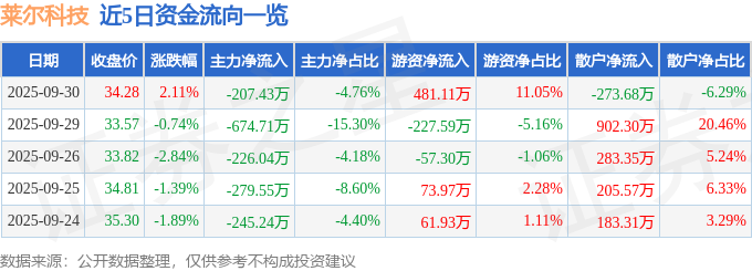 证券之星消息,截至2025年9月30日收盘,莱尔科技(688683)报收于34.28元,上涨2.11%,换手率0.82%,成交量1.27万手,成交额4354.51万元。