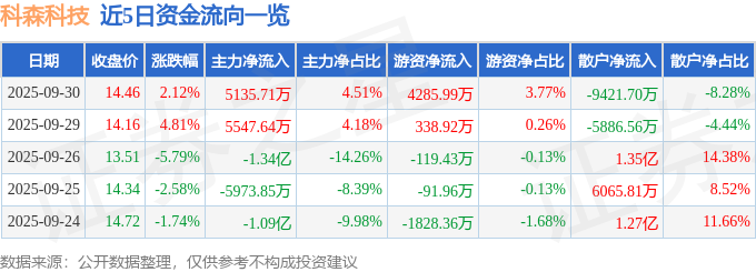 证券之星消息,截至2025年9月30日收盘,科森科技(603626)报收于14.46元,上涨2.12%,换手率14.11%,成交量78.29万手,成交额11.38亿元。