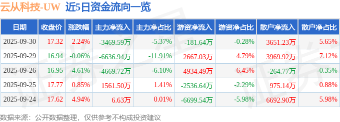 证券之星消息,截至2025年9月30日收盘,云从科技(688327)报收于17.32元,上涨2.24%,换手率4.46%,成交量37.17万手,成交额6.46亿元。