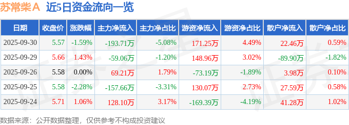 证券之星消息,截至2025年9月30日收盘,苏常柴A(000570)报收于5.57元,下跌1.59%,换手率1.22%,成交量6.8万手,成交额3813.92万元。
