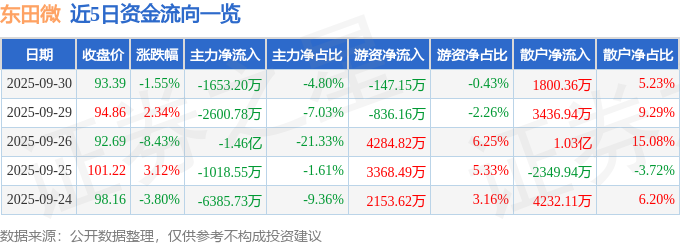 证券之星消息,截至2025年9月30日收盘,东田微(301183)报收于93.39元,下跌1.55%,换手率6.22%,成交量3.65万手,成交额3.45亿元。