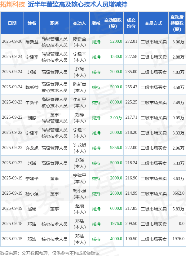 拓荆科技近半年内的董监高及核心技术人员增减持详情如下: