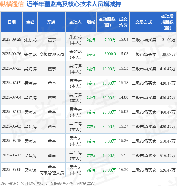证券之星消息,根据9月30日市场公开信息、上市公司公告及交易所披露数据整理,纵横通信(603602)最新董监高及相关人员股份变动情况:2025年9月29日公司董事朱劲龙共减持公司股份7.0万股,占公司总股本为0.0305%。变动期间公司股价上涨1.97%,9月29日当日收盘报14.99元。