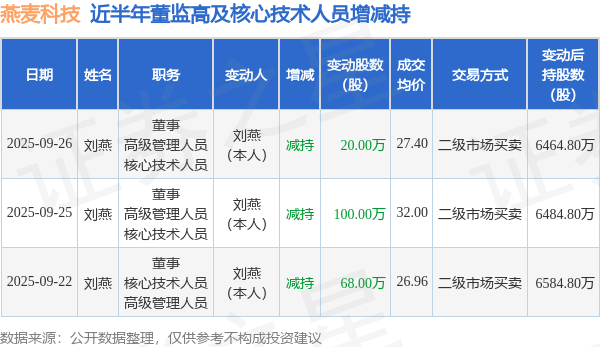 燕麦科技近半年内的董监高及核心技术人员增减持详情如下: