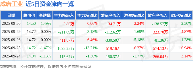 证券之星消息,截至2025年9月30日收盘,威唐工业(300707)报收于14.5元,下跌1.49%,换手率2.88%,成交量4.13万手,成交额6022.34万元。