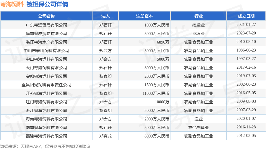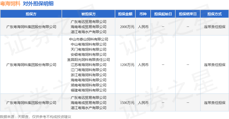 粤海饲料9月29日披露3笔对外担保,被担保公司14家。对外担保明细如下表: