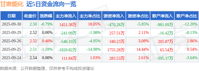 证券之星消息,截至2025年9月30日收盘,甘肃能化(000552)报收于2.5元,下跌0.79%,换手率0.86%,成交量32.15万手,成交额8038.92万元。