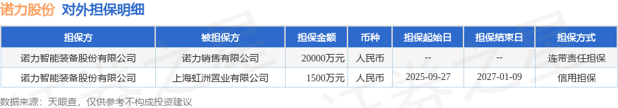 诺力股份9月29日披露2笔对外担保,被担保公司2家。对外担保明细如下表: