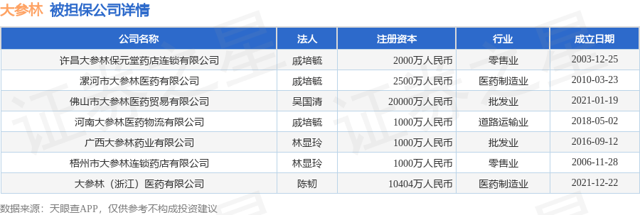 大参林9月29日披露7笔对外担保,被担保公司7家。对外担保明细如下表: