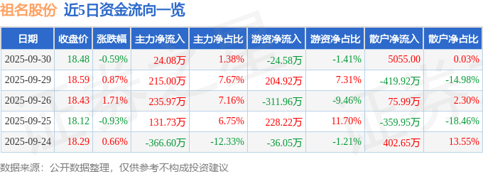 证券之星消息,截至2025年9月30日收盘,祖名股份(003030)报收于18.48元,下跌0.59%,换手率1.19%,成交量9451.0手,成交额1745.53万元。